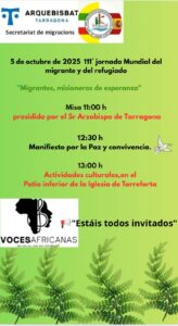 El día 5 de octubre 2025, la Iglesia Católica celebraba la 111 Jornada Mundial de migrantes y refugiados. La Misa fue presidida por el Arzobispo de Tarragona, Excmo D. Joan Planellas I Barnosell y concelebrada por los sacerdotes de la Zona del Poniente de Tarragona: el Padre Clemente Lucena, el Padre Andrés Pedro Sima Miaga y el Padre Yuri, de Ucrania de rito Greco-romano.